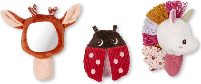 Táto sada 3 látkových hrkálok je vhodná od narodenia. Plyšové zvieracie hrkálky prebúdzajú zvedavosť tých najmenších a stimulujú ich zmysly. Jednorožec Lena a jej očarujúce krídla, ktoré vydávajú zábavný šuštivý zvuk, koloušok Stella s malým zrkadlom a lienka, sa skladá z niekoľkých textúr, ktoré môže dieťa objavovať končekmi prstov. Ich tvar bol navrhnutý pre ľahkú manipuláciu tými najmenšími. Je to skvelý tip na darček, pretože je dodávaný v krásnej krabičke. Možno prať na ručné pranie.