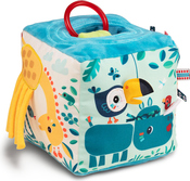 Táto textilná kocka s aktivitami vezme vaše ratolesti do tajomnej džungle, kde je pre nich pripravených mnoho zážitkov na objavovanie. Vzory, farby, textúry, zrkadlo, hryzátko a hrací strojček so 7 rôznymi zvukmi zvierat z džungle.