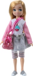 Bábika oblečená v tričku s potlačou tortičky cupcake, striebornej sukni, šedo-ružových pruhovaných kraťasoch, strieborných teniskách, na ramene má ružovú kabelku.