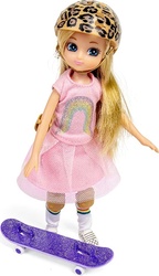 Na rampe sa blíži parádna skateboardistka, ktorá zlepšuje svoj finiš drsným kickflipom! Táto bábika má helmu s leopardím vzorom, chrániče lakťov a kolien, dúhové tričko, ružovú sukňu a kockované tenisky.