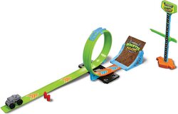 Pestrofarebná závodná dráha so slučkou a rampou, ktorá odpáli rozbehnuté autíčko do vzduchu.
