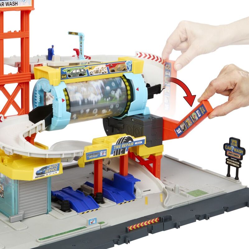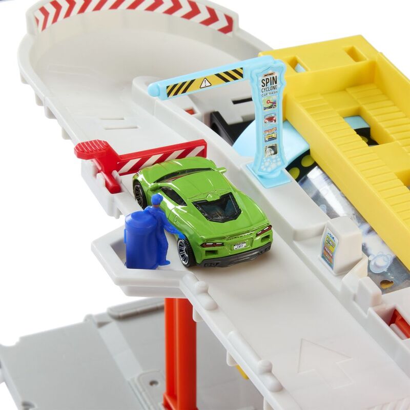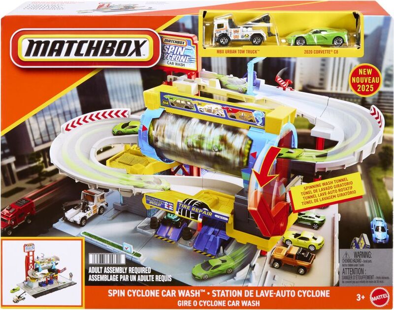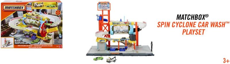 Matchbox Turbo Cyclone Car Wash je interaktívna umývačka áut, dielňa a parkovisko v jednom. Súprava umožňuje príbehy o opravách, testoch pneumatík a veľkolepom „kaskadérskom“ čistení v priehľadnom tuneli. Sada obsahuje odliatok v mierke 1:64 Corvette auto a odťahové vozidlo, ktoré ďalej vylepšujú hrateľnosť.