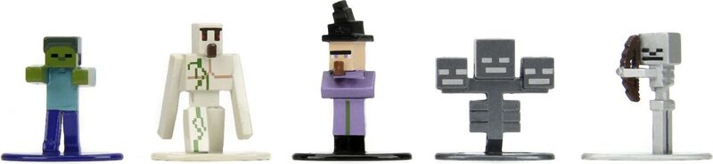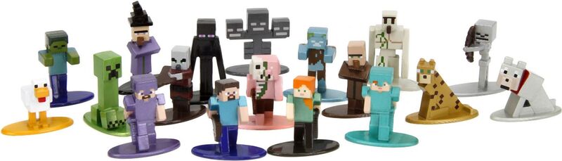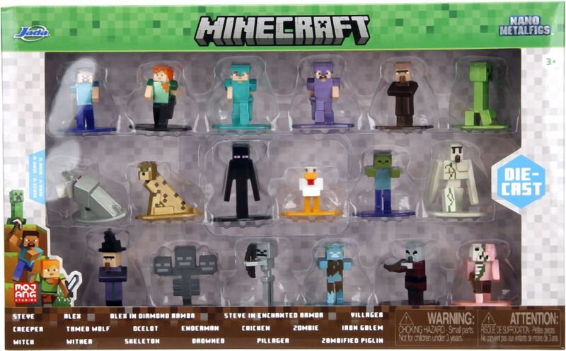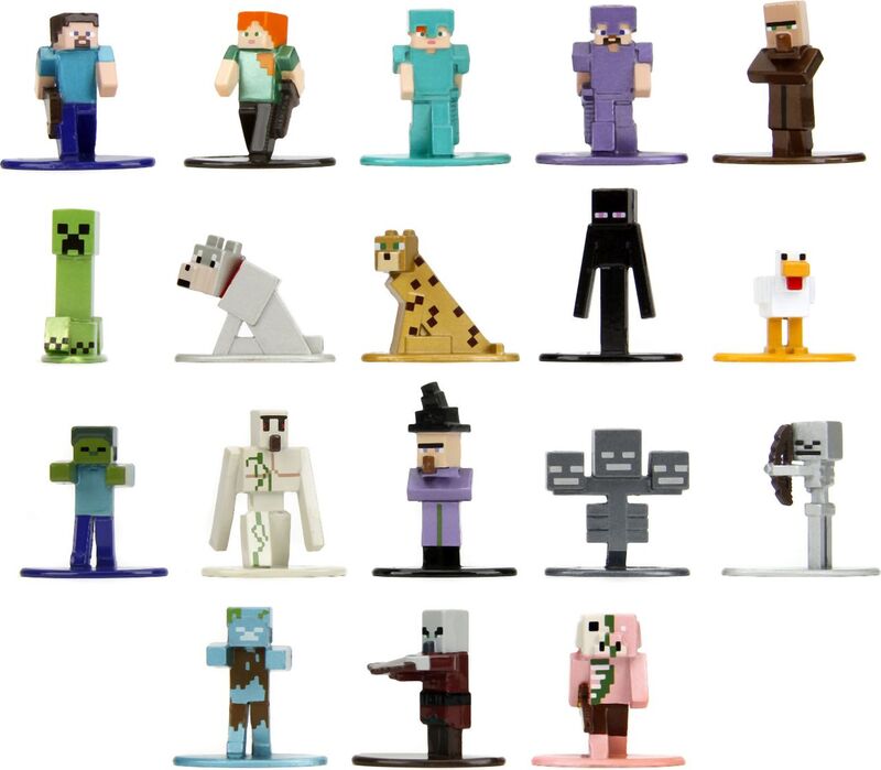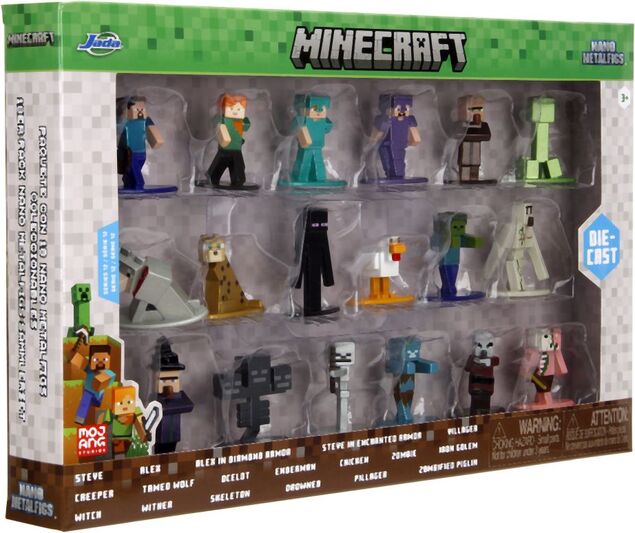 Sada obsahuje 18 licencovaných kovových figúrok s výškou 4 cm, vrátane Steva, Alexa, zombie, Creepera, kostlivca, kurčaťa, psa, železného golema a mnohých ďalších obľúbených postáv z hry. Každá figúrka je vyrobená technológiou tlakového liatia, ktorá zaisťuje pevnosť a odolnosť a vyznačuje sa aj vysokými detailmi a jasnými farbami.