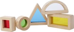 Najmä kocka so zrkadlovou fóliou ohromí tých najmenších. Päťdielna súprava obsahuje trojuholník, obdĺžnik, štvorec, kruh a fóliu so zrkadlom.
