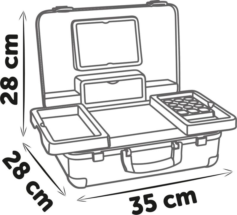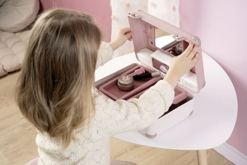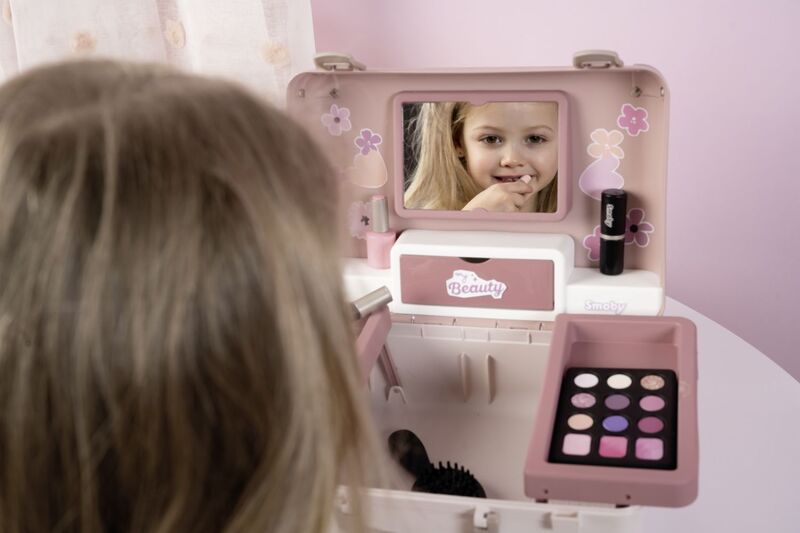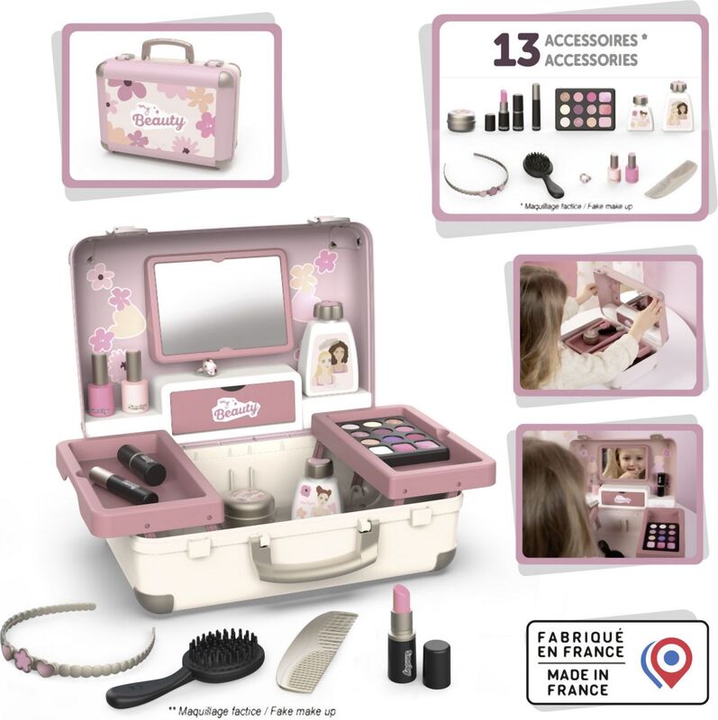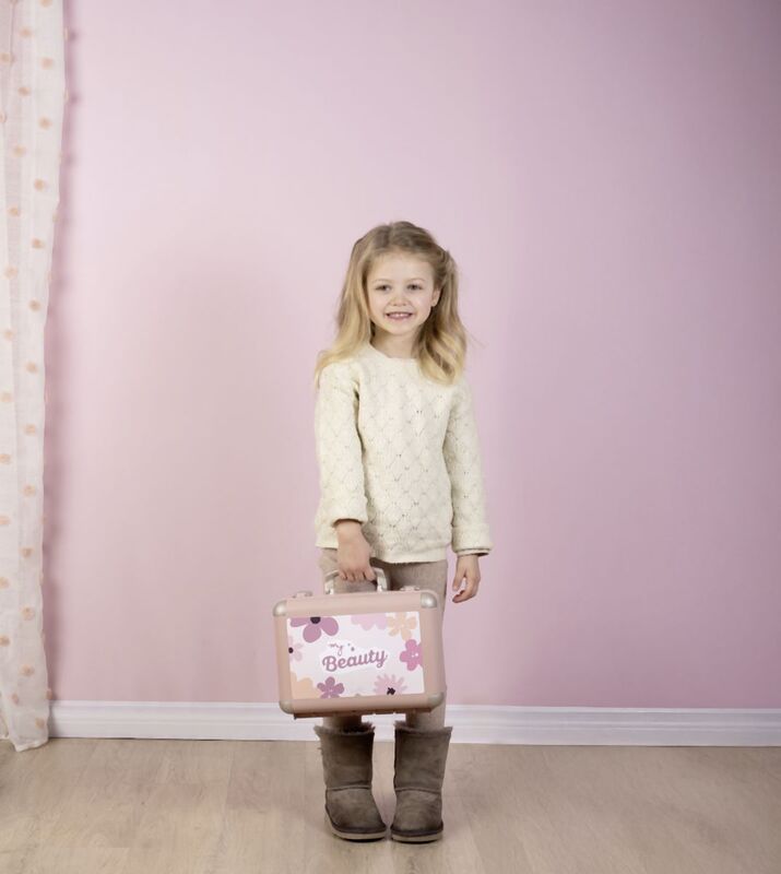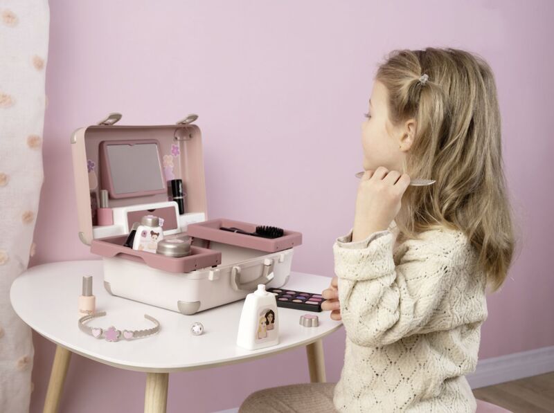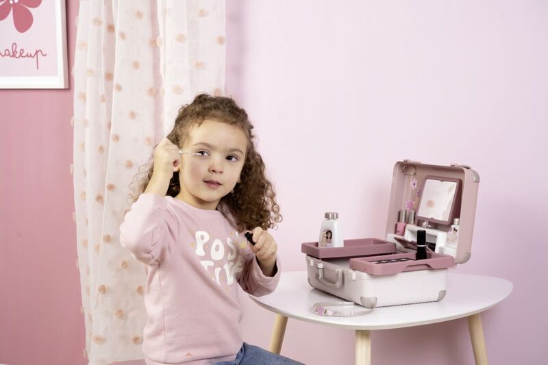Všetkých 13 doplnkov (atrapy kozmetiky na hranie) nájdete vo vnútri kufríka s rukoväťou, ktorý je možné vziať kamkoľvek: