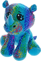 Veselé plyšové zvieratko - sediaci nosorožec v modrom prevedení, s trblietavými dúhovými detailmi, pre všetkých milovníkov plyšákov.