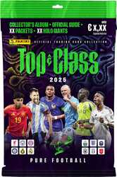 Startovací sada PANINI TOP CLASS 2025 obsahuje: sběratelské album, oficiálního průvodce, 24 karet + 2 limitované karty HOLO GIANTS.