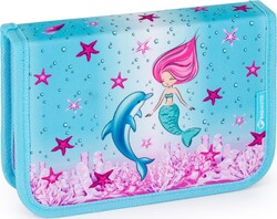 Ružovo-modrý peračník s podmorským svetom pre malé školáčky. Na dvoch otváravých chlopniach sú gumové úchyty na ceruzky, perá a pastelky. Kvalitný kovový zips a priehľadné vrecko na rozvrh so samolepkami, ktorý dostanete ako darček.