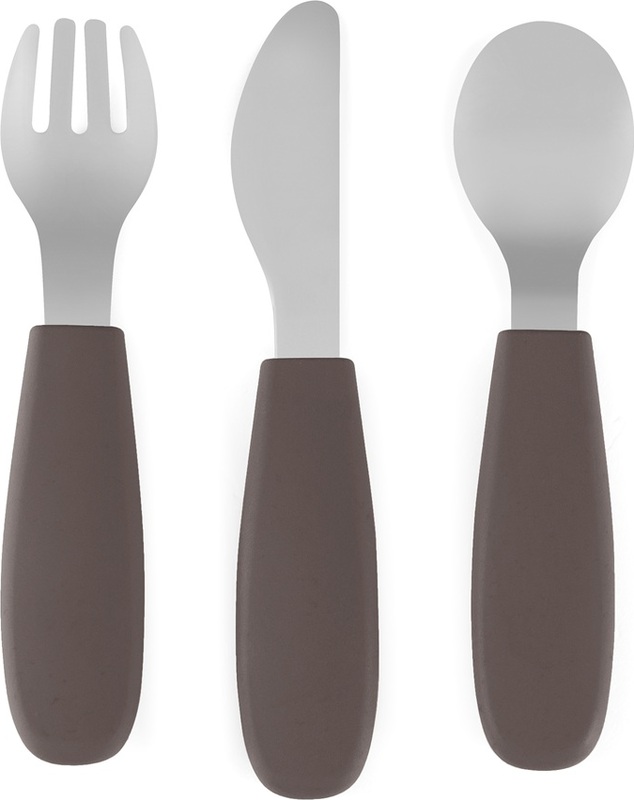 Funkčné časti sú vyrobené z kvalitnej nehrdzavejúcej ocele, rukoväte sú ergonomické a potiahnuté mäkkým silikónom vhodným na kontakt s potravinami – ideálne prispôsobené detským rúčkam. To zaručuje pohodlný a istý úchop a podporuje správne stravovacie návyky.