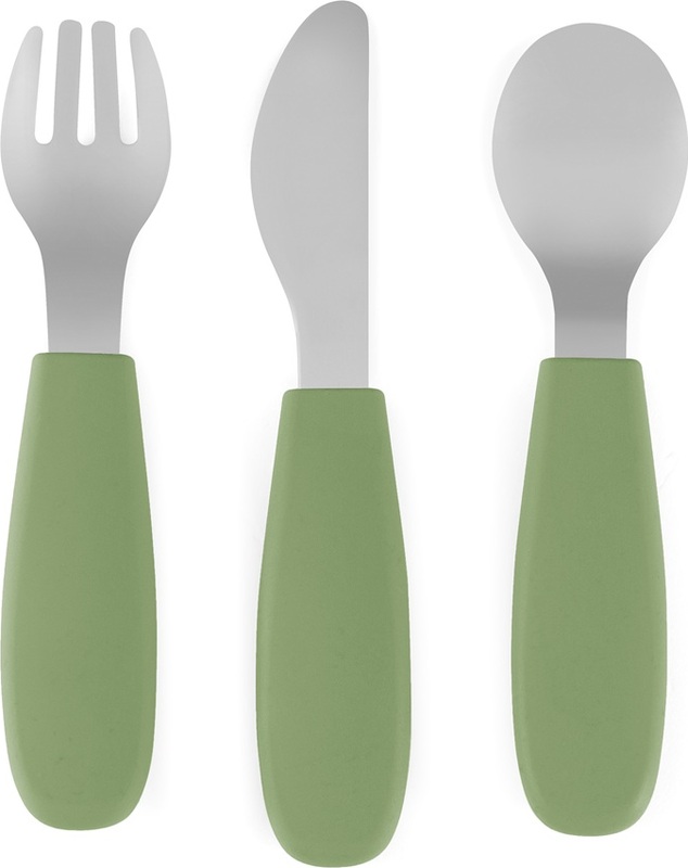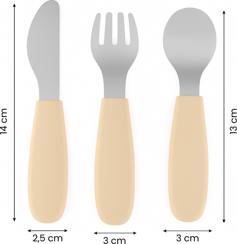 Funkčné časti sú vyrobené z kvalitnej nehrdzavejúcej ocele, rukoväte sú ergonomické a potiahnuté mäkkým silikónom vhodným na kontakt s potravinami – ideálne prispôsobené detským rúčkam. To zaručuje pohodlný a istý úchop a podporuje správne stravovacie návyky.