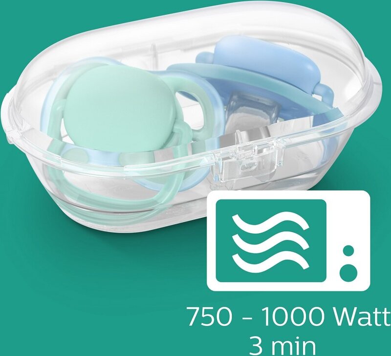- Sterilizátor / obal na prenášanie umožňujú sterilizovať cumlík vášho dieťaťa v mikrovlnnej rúre a nosiť ho so sebou.