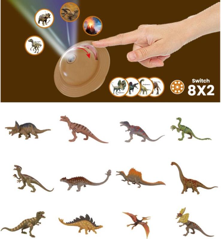 Projektor s motívmi dinosaurov: Hlavnou časťou sady je projektor, ktorý po vložení jedného z dvoch priložených kotúčov premieta na stenu alebo strop obrázky rôznych druhov dinosaurov. Projektor je navrhnutý tak, aby sa deťom ľahko ovládal. Každý kotúč obsahuje sadu farebných obrázkov tých najznámejších dinosaurov, ako je T-Rex, Triceratops, Brachiosaurus a ďalšie.