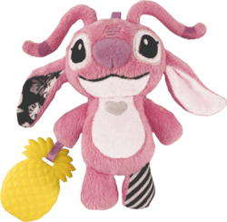 Rozkošná plyšová hračka Stitch s množstvom aktivít: šuštiace ušká, dva mäkké plastové doplnky na žuvanie a hrkálka vo vnútri plyšu. Praktický klip uľahčuje zavesenie kdekoľvek.