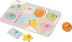 Vkladacie drevené puzzle s úchytkami od spoločnosti CLASSIC WORLD pozostáva z hrubej tabule s rôznymi geometrickými tvarmi v pastelových farbách. Pomáha dieťaťu rozpoznať ploché geometrické obrazce vizuálne aj hmatom. Keď sa deti snažia umiestniť tvary puzzle na správne miesta alebo vytvárať kombinácie, rozvíjajú si tým schopnosti rozlišovania tvarov a farieb.