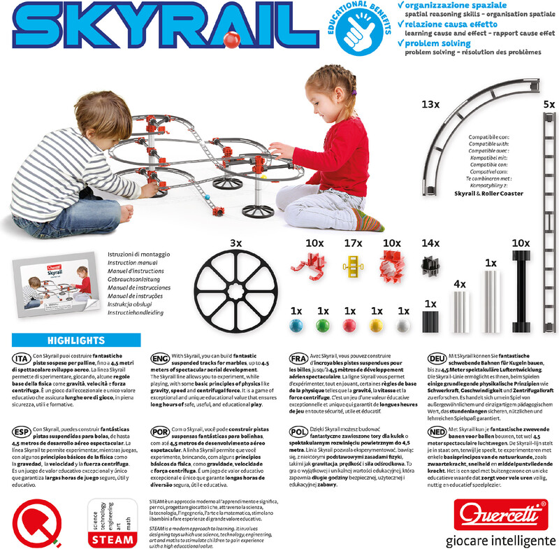 Horská guličková dráha Skyrail ponúka vzrušujúce preteky s guličkami na dlhé a kľukaté trate. Deti si pri stavaní rozvíjajú fantáziu a zručnosť a počas hry spoznávajú jednoducho a zábavne, ako funguje rýchlosť, gravitácia, odstredivá sila alebo trenie. Dráhu je možné zostaviť až do dĺžky 4,5 metra a je navrhnutá tak, aby fungovala s rôzne veľkými guličkami. Skvelá voľba pre všetkých malých staviteľov a objaviteľov, ktorí chcú nielen pretekať, ale aj skúmať svet okolo seba.