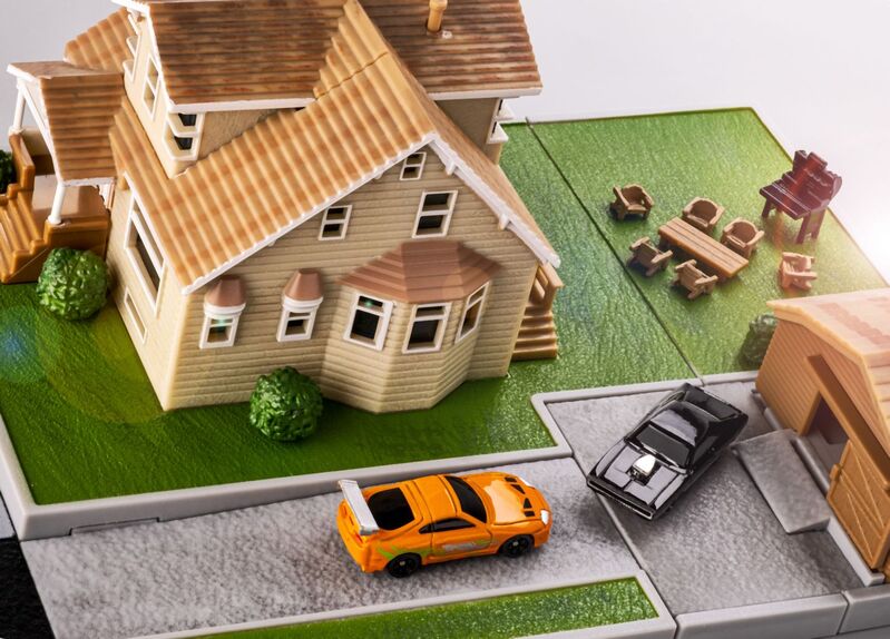 Dioráma domu a záhrady Dominika Torreta z akčného filmu Rýchlo a zbesilo Dominik s garážou.