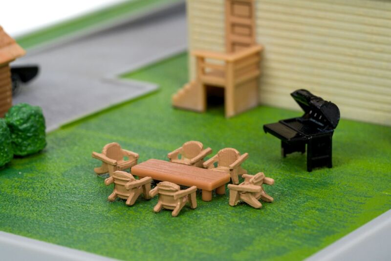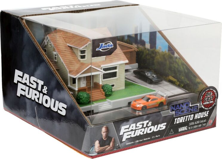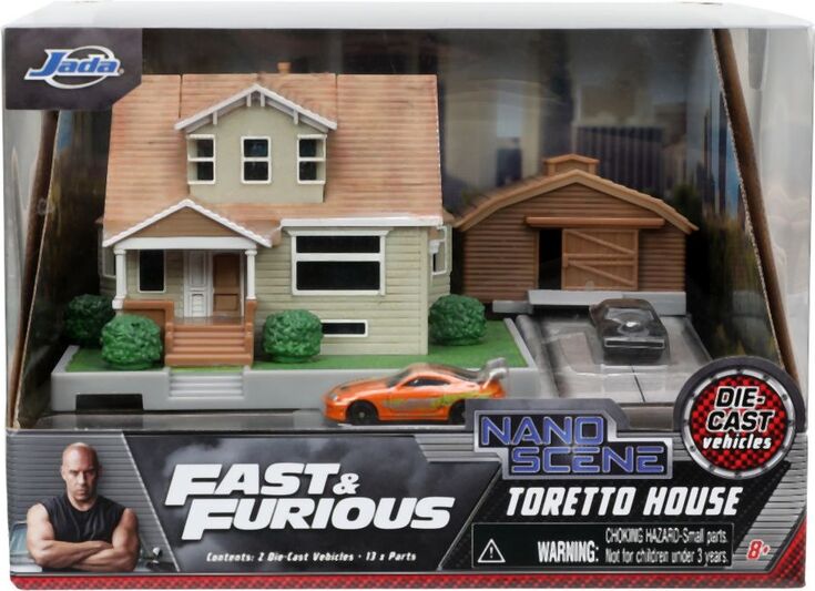 Súčasťou 2x kovové nanoauto na volnobeh (Dodge Charger a Toyota Supra), majú otočné kolesá a gumové pneumatiky, záhradný gril a nábytok.