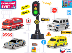 Súprava štyroch áut s dopravnými značkami a semaforom so svetelnými efektmi.