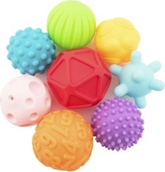 Súprava 8 farebných gumových loptičiek. Každá loptička má na svojom povrchu inú textúru.