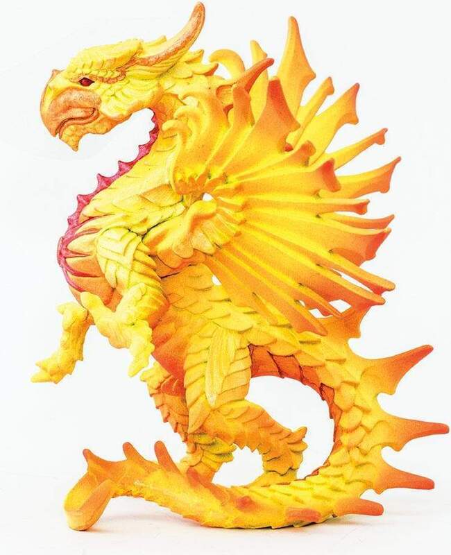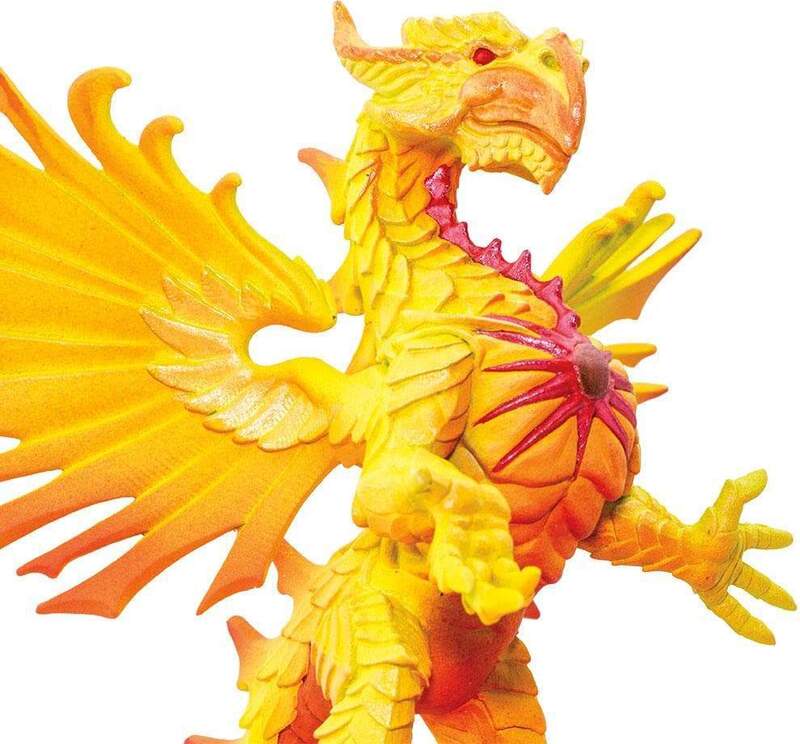 Veľkosť a farba: Žiarivo žltá, s odtieňmi červenej a oranžovej ako plameň, Slnečný drak ohromuje každého, kto sa na neho pozrie. Figúrka je vysoká 5 palcov (cca 12,7 cm) a má pôsobivé rozpätie krídel 6 palcov (cca 15,2 cm).
