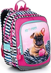 Hlavná charakteristika: pevný lisovaný chrbát ľahký - neváži ani 1 kg! množstvo reflexných prvkov nastaviteľné ramenné popruhy a hrudný pás Psíci sú naše stálice. Tento rok sme na obľúbený strih ENDY nakreslili obrázok francúzskeho buldočka s ružovým príveskom, ktorý nájdete na zipse. Taška ENDY je klasika do 1. - 3. triedy ZŠ, jej hlavnou výhodou je ľahká váha. Dve hlavné komory dopĺňa na čele tašky hlboké vrecko. Zadná komora je širšia, dajte do nej tie najťažšie slabikáre a učebnice. Predná komora je o niečo užšia, ideálna na prenášanie peračníka PENN 22005, krabičky s desiatou, alebo na ďalšie drobné školské potreby. Malé denníčky a ďalšie drobnosti dajte do sieťového vrecka na zips vo vnútri prednej komory. Nad ňou je ešte menovka, aby sa viac rovnakých batohov v triede neplietlo. Vnútri predného hlbokého vrecka je potom odnímateľná karabína na kľúče. Chrbát tašky je lisovaný z pevnej, tvarovanej peny. Ramenné popruhy sú ergonomicky tvarované, mäkko polstrované a sú doplnené hrudnou prackou. Dlhé konce ramenných popruhov môžete pripnúť k telu popruhu vďaka všitým magnetom. Fľaštičku na pitie, ideálne o veľkosti do 0,5 litra - napríklad našu ZOLA, umiestnite na bok tašky do pevného vrecka. Reflexné prvky sú samozrejmosťou - nakdete ich v paspuliach predného vrecka a komory, prednom vrecku, bokoch tašky aj na ramenných popruhoch.Ďalšie vychytávky: uško s plastovou rukoväťou na prenášanie tašky v ruke pútko na zavesenie tašky na háčik pri lavici záter proti dažďu - látka nepremokne odolné dno tašky z pevného materiálu TOPDURA s plastovými nôžkami taška bola testovaná v ITC Zlín, kde prešiel na jednotku Náš tip: Taška je superľahká, ale učenie v prvých triedach niečo váži. Nepreťažujte zbytočne chrbát žiaka, dávajte mu do tašky iba to učenie, ktoré v daný deň potrebuje a kontrolujte tašku. Občas je v nej v prvých triedach viac hračiek, ako učenia...