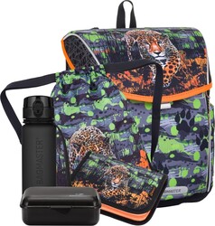 Chlapčenská súprava Bagmaster s tajomnými leopardími očami. Aktovka má priehľadnú a priestrannú priehradku, veľkú prednú priehradku s organizérom, bočné vrecko na fľašu, reflexné prvky a purpurovú pracku na chlopni. Je vhodná pre žiakov prvého a druhého stupňa základných škôl. Súčasťou aktovky je leopardie vrecko, vrecko na papuče alebo športové oblečenie a súprava na desiatu. PRIMa set obsahuje: školskú aktovku pre prvákov a druhákov dvojchlopňový peračník, vak na prezuvky alebo telocvik, desiatovú krabičku s ceritifkátom nezávadnosti, fľašu na pitie s objemom 0,5 l s certifikátom nezávadnosti. Prečo je aktovka PRIMa voľba pre každého malého školáka? Veľká priestranná komora aktovky je rozdelená prepážkami do troch častí. Zmestia sa sem veľké dosky, slabikár aj zošity A4, menšie učebnice. Do predného vrecka patrí puzdro a desiata v krabičke. Na fľašu s pitím a dáždnik sú z bočnej strany našité vrecká s gumou. Aktovka má pevné dno (výlisok potiahnutý čiernou 600 D polyesterovou látkou) aj stabilnú konštrukciu – neprevracia sa, stojí pri lavici aj bez zavesenia a dobre sa nasadzuje na chrbát. Pre lepšie držanie tašky na ramenách je súčasťou hrudný pás. Odľahčený bedrový pás (dá sa odopnúť) pomáha správnemu rozloženiu váhy, aby aktovka nepreťažovala chrbát a dieťa sa pod váhou príliš nepredkláňalo. Oba pásy a ergonomicky tvarovaná chrbtová časť podporujú správne vzpriamenú postavu pri chôdzi. Pásy aj popruhy sú zladené vo farbách aktovky. Na peňaženku, mobil, vreckovky a ďalšie drobnosti je organizér v prednom vrecku uzatvárateľné na suchý zips. Celá aktovka (všetky priehradky v hlavnej komore a vrecko na suchý zips) sa uzatvára klopou s novou vychytanou magnetickou prackou. Z vnútornej strany klopy je priehľadné vrecko. Reflexné prvky v tme podrthujú tajomný motív aktovky. A dieťa je s nimi v bezpečí aj v chmúrnom zimnom počasí. Svietiace prvky spĺňajú normy EU/EN. Na aktovke je štýlový prívesok zladený s obrázkom. Ďalšou zaujímavou fičúrou je termoetiketa s logom. Zaujme zaujme na prvý dotyk. V zime je čierna, v teple zoranžoví. Vyskúšajte zmenu farby priložením teplej dlane. Aktovky a batohy Bagmaster odporúča špecialistka na liečbu detskej skoliózy a rehabilitačná lekárka Kateřina Smíšková (prečítať si odporúčania). Vrecko a kľúčenka, ktoré vidíte na niektorých obrázkoch, nie sú súčasťou aktovky. Priobjednať ich môžete v kategórii doplnky. Vek: 6+