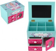 Šperkovnica bude ideálnym miestom na uloženie pokladov každého dievčaťa. Je vyrobená z dreva, má modrú farbu a je pomaľovaná krásnym motívom princeznej a kvietkov. Táto šperkovnica bude ideálny doplnok pre detskú izbu. Pod krytom so zrkadlom je priestor na organizovanie suvenírov alebo šperkov. Šperkovnica má tri zásuvky na uschovanie ešte viac pokladov.
