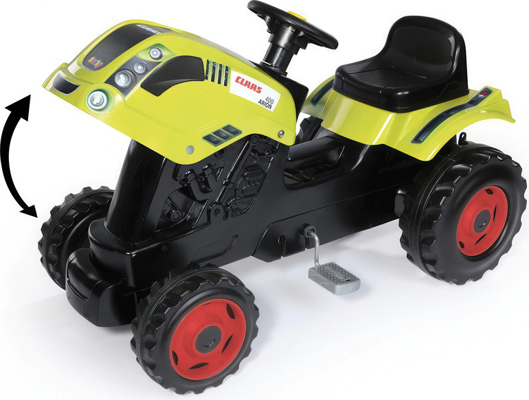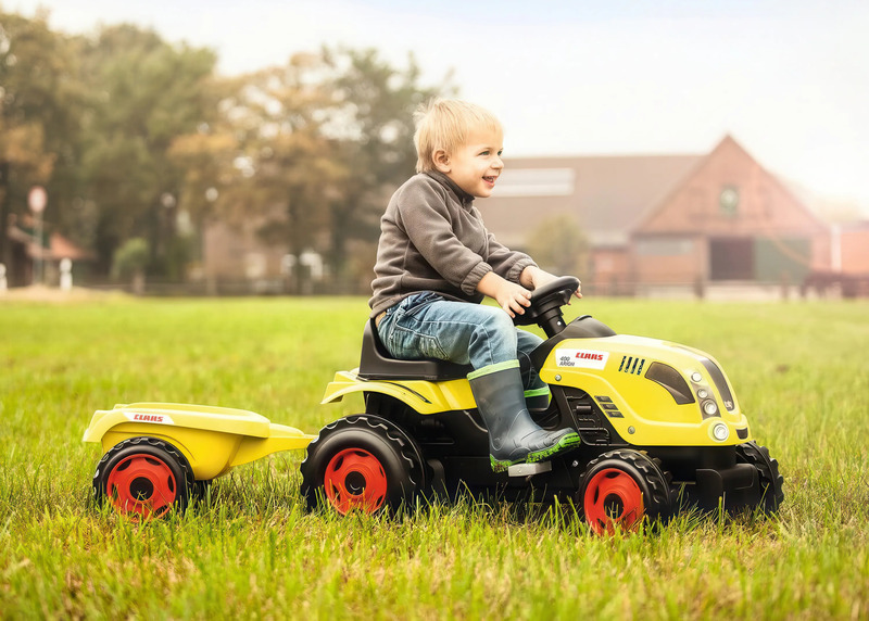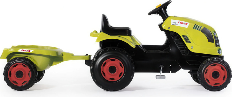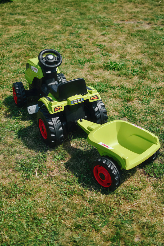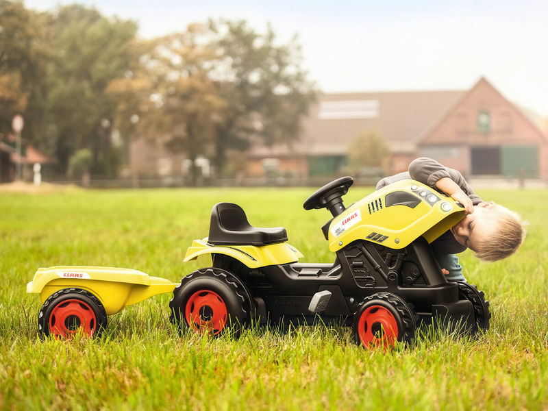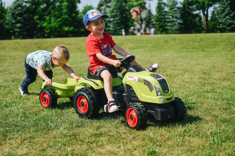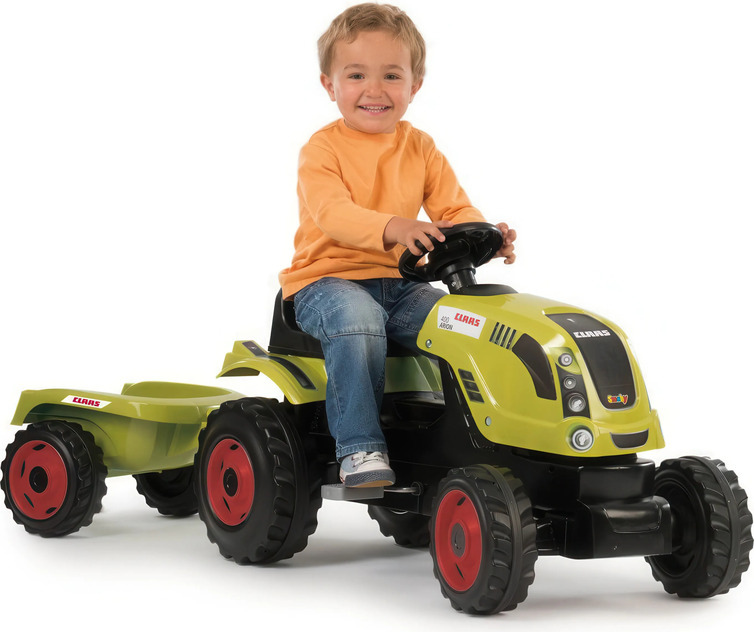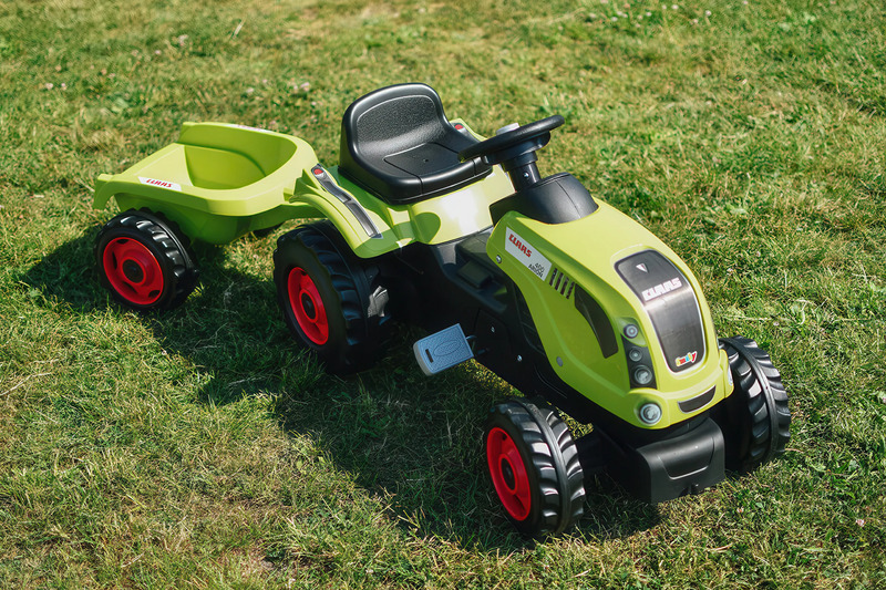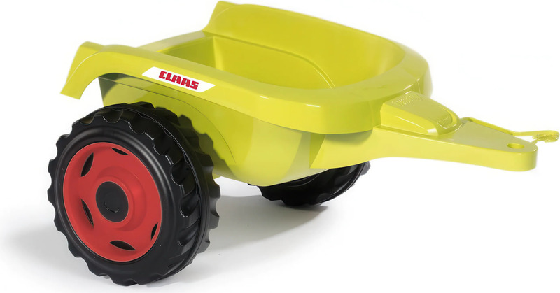 Šliapací traktor CLAAS s volantom a prívesným vozíkom, ktorý je možné odpojiť.