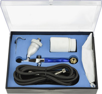 V balení je pištoľ, s dávkovacou nádobou, držiak pištole, hadica so šróbením, fľaša so 100 g korundového abrazíva a tvárové rúška.