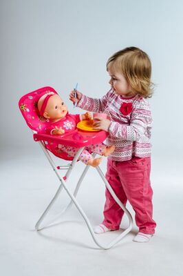 Vysoká stolička so stolíkom, v ktorej si môžu dievčatká svoju bábiku nakŕmiť.