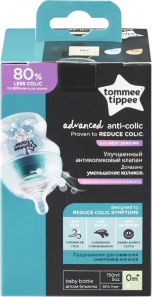 Dojčenská fľaša C2N ANTI-COLIC Tommee Tippee. Najúčinnejšie riešenie pre bábätká so sklonom k brušným kolikám. Ultracitlivý antikolikové ventil zaisťuje dokonalý odvod vzduchu počas dojčenia a umožňuje dieťaťu úplne plynulé satie bez prehĺtania vzduchu. Unikátny silikónový cumlík verne napodobňuje materský prsník pri dojčení a tým umožňuje mamičkám jednoduché a bezpečné kombinovanie dojčenie a kŕmenie z lahve.Funkce kontroly teploty mlieka vnútri fľaštičky varuje rodičov v prípade, že je tekutina teplejšia než odporúčaných 37 ° C. Fľašky sú vhodné od narodenia. Neobsahujú bisfenol. Náhradné silikónové cumlíky k týmto fľaštičkám nesú tiež označenie Anti-Colic.