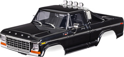 Traxxas karoséria Ford F-150 1979 čierna, pre RC model auta TRX-4M s dlhším rázvorom 162 mm (High Trail). Bez-sponková karoséria v mierke 1:18 z ABS, kompletná, vrátane mriežky chladiča, zrkadiel, kľučiek dverí, ochranného rámu, stieračov, bočných líšt a ďalších detailov. Vyžaduje predný a zadný nárazník TRA9834.