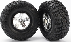 Kompletné predné kolesá pre 2WD autá Traxxas Slash. Saténové disky s čiernymi ráfikmi Bead Lock s nalepenými pneumatikami Kumho (mäkká zmes) a vložkou.