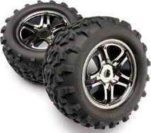 Kompletné kolesá pre RC autá. Disky vo farbe čierny chróm Split Spoke s nalepenými pneumatikami Maxx a vložkou.