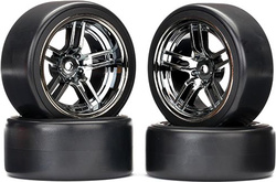 Kompletné predné aj zadné kolesá pre RC modely auta Traxxas 4-Tec 2.0. Disky Split-spoke Čierny chróm s pneumatikami Drift (v balení 2ks predný +2ks zadný).
