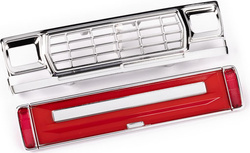Náhradný diel pre RC model áut Traxxas TRX-4M Ford F-150 1979: maska karosérie červená (pre #9812). Chrómovaná predná mriežka a červený zadný panel. Vrátane zadných parabol svetiel.