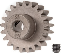 Traxxas pastorok na hriadeľ 5 mm s 21 zubami a modulom ozubenia 1 mm pre RC modely áut. Vyrobené z sintrovanej ocele. Súčasťou balenia je nastavovacia skrutka.