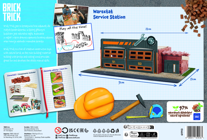Postavte si servisnú stanicu s použitím skutočných tehál, dreva a dekoratívnych prvkov. Použite priložené stavebné plány alebo použite svoju fantáziu na vytvorenie jedinečnej konštrukcie. Tam zábava nekončí! Rozpustite štruktúru vo vode a pokračujte v stavaní s rovnakými tehlami!Balenie obsahuje: skutočné tehly, drevené dosky, lepidlo, ozdobné prvky, stojan, nálepku a návod.