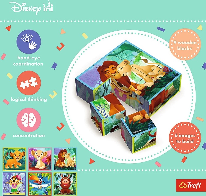 Ponorte sa do magického sveta populárnej rozprávky Leví kráľ ! Táto klasická drevená hračka s moderným nádychom je ideálna pre všetkých malých fanúšikov rozprávky, ktorí radi skladajú, porovnávajú a objavujú farebné ilustrácie svojich obľúbených postáv.
