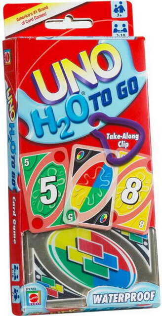 Vezmi so sebou na cesty túto cestovnú verziu hry UNO! Pevné plastové karty sú odolné voči vode a zábavu si s nimi môže užiť každý, a to doma aj vonku na cestách. UNO H2O Na cesty obsahuje aj praktickú karabínu, ktorá karty udrží pri sebe a dá sa pripojiť k plážovej taške, batohu alebo ku kempovacej výbave. Teraz budete pripravení hrať UNO, kedykoľvek sa vám zachce!