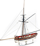 Balenie obsahuje laserom rezané a gravírované diely vyrobené z MDF a hruškového dreva, laserom gravírovaná a rezaná doska z lipového dreva s detailmi, 3 doštičky vyrobené z fotoleptaných mosadzných dielov, 3D tlačené diely s vysokým rozlíšením, dvojplankový trup je z lipového dreva dreva pre druhé dosky obšívky, okrúhle lišty z orechového dreva pre sťažene, rahná a výložník. Niekoľko veľkostí čierno a prírodne sfarbené nite pre lanové, rovnako ako všetky potrebné súčasti. Komplexný, farebný návod na použitie spolu s 11 plánikmi obsahujúcimi všetky výkresy sťažňa a lanoví - manuál EN.