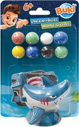 Súprava obsahuje vrhač guličiek v tvare žraloka, dva obojstranné terče a osem farebných guličiek.