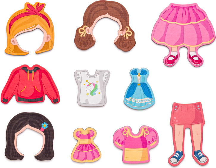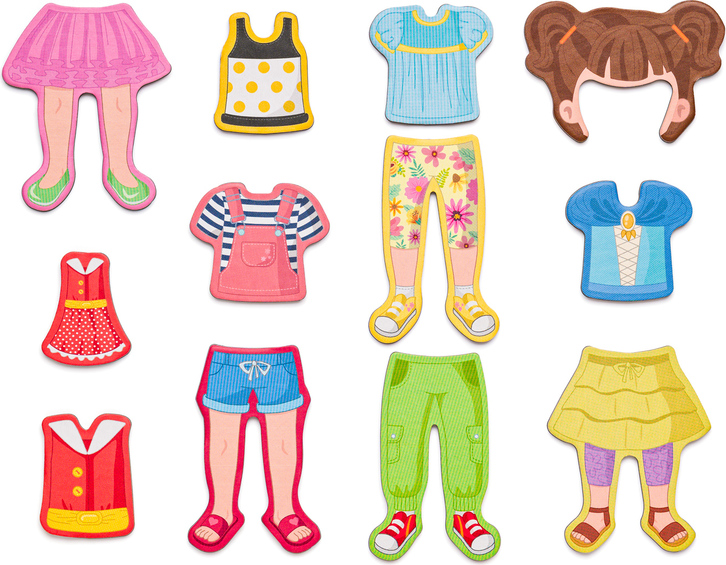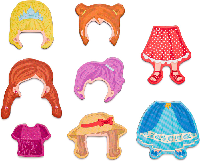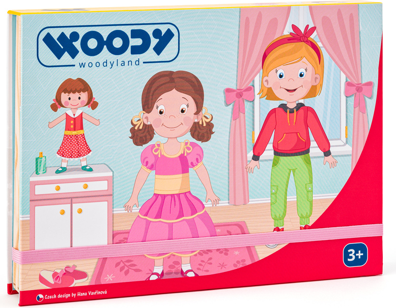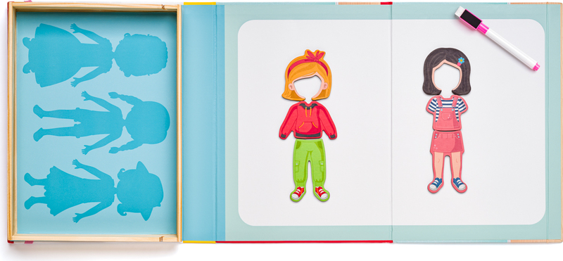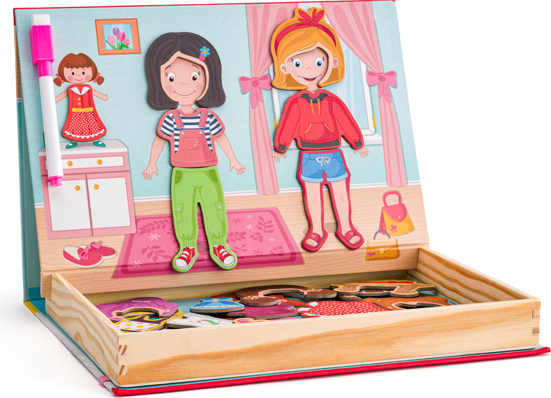 Otvor drevenú krabičkou plnú magnetických oblečkov a vytvor dokonalé outfity pre dve dievčatká na magnetickom veku. Kombinuj tričká, sukne, nohavice, šaty aj účesy - a nezabudni obliecť aj ich bábiku! Inšpiruj sa priloženými kartičkami s módnymi tipmi.
