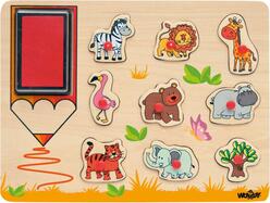 Sada pečiatky Exotické zvieratá je skvelá kombinácia pečiatok a drevených puzzle. Na spodnej strane každého zvieratka je gumové tiskátko, pre ktoré nájdete priamo na ploche tohto výrobku farebný vankúšik.